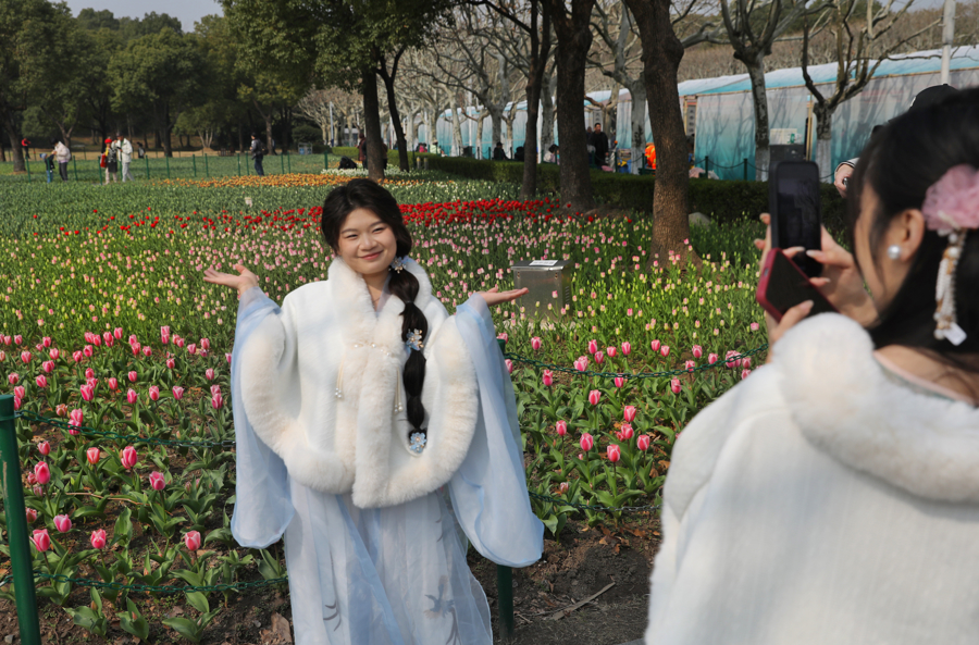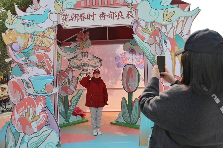 活动期间,正值大宁公园樱花、海棠、白玉兰等春季花卉的盛花期,约1.2万平方米的百万株郁金香也已芬芳成海。花朝节主会场充分利用生态资源及场地优势,依景造境,沿花田、花林精心布局国风艺术美陈,植入花田禧市、非遗市集、华服展陈、文化手作沙龙、民俗表演舞台等元素,沿途还能邂逅诗词歌赋、茶肆雅集,为前来游园的游客打造了一条玩乐不倦的1公里活动“主动线”。
