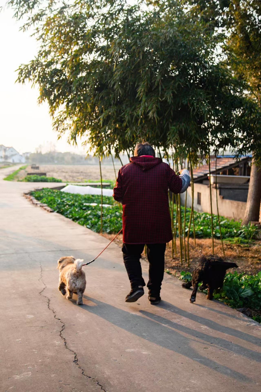 一旁的照片里,王奶奶牵着两只狗在落日余晖中散步,被光拉长的背影仿佛诉说着乡村里的另一种陪伴。