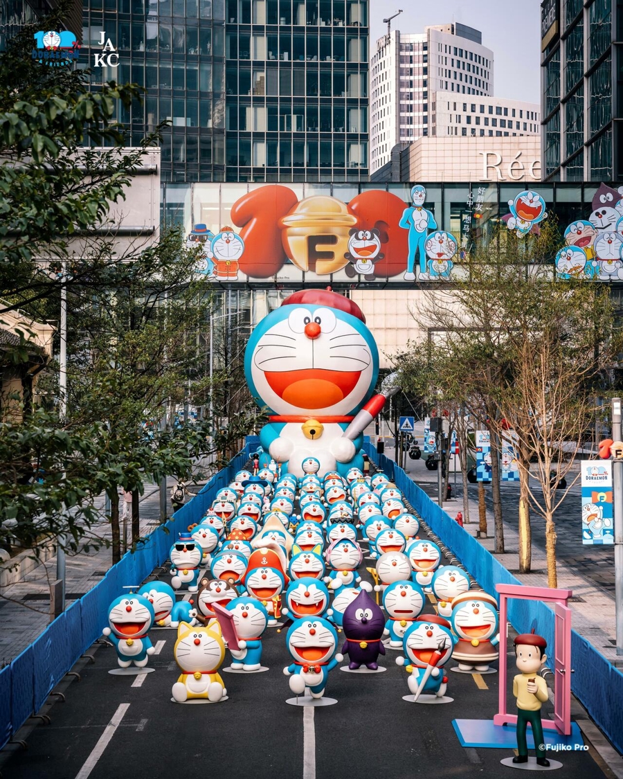 在贯穿静安嘉里中心的安义路上,12米高的巨型充气哆啦A梦矗立在路中央,近百个各式动漫、电影形象哆啦A梦雕塑分布在街区上,气势十足,引发市民游客驻足、拍照。在为期一日的快闪秀期间,大雄、静香、胖虎、小夫、哆啦美等粉丝熟知的哆啦A梦“亲友团”纷纷现身,连同近百个1:1哆啦A梦雕塑现身于安义路。