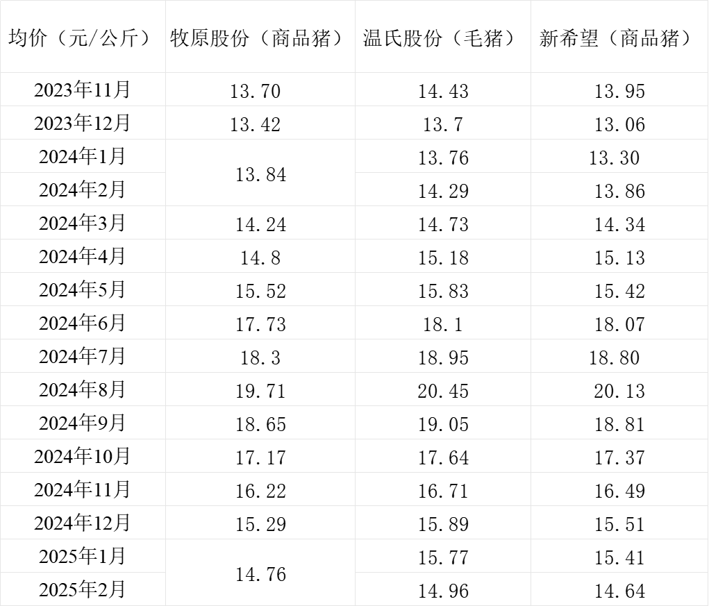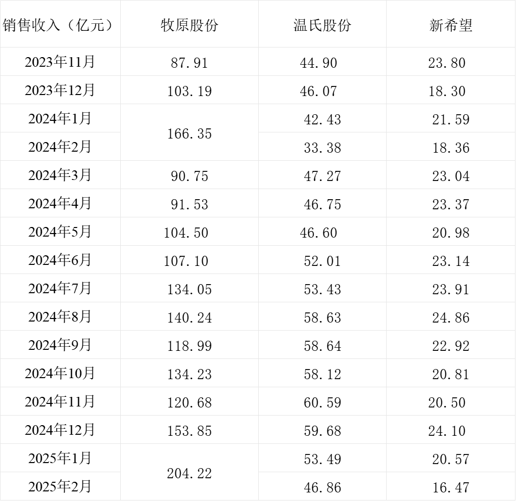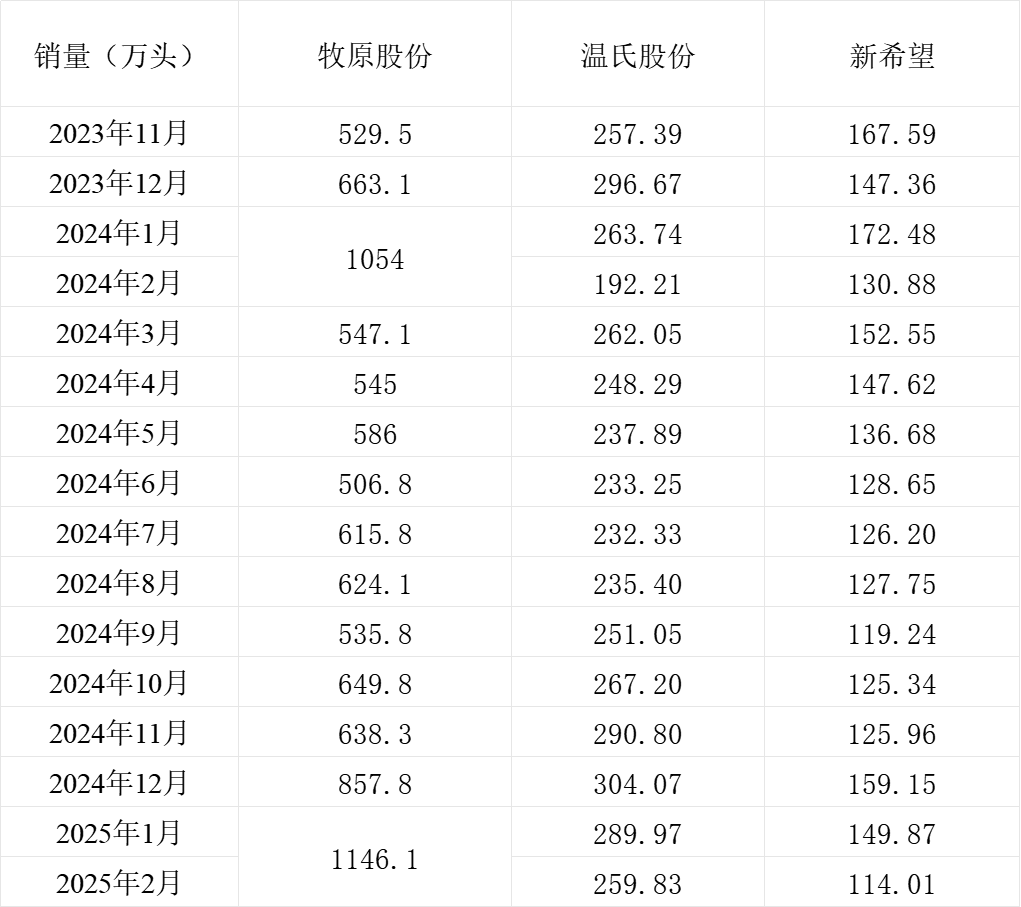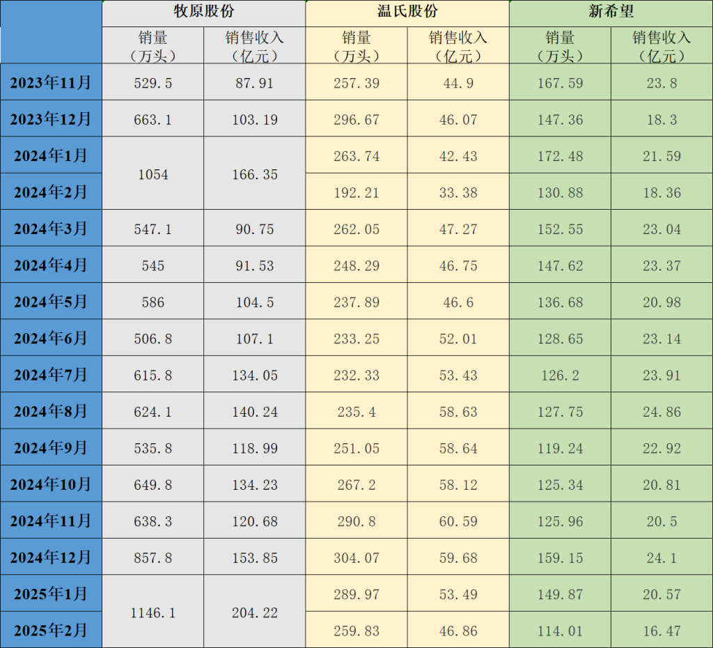 三大上市猪企牧原股份(002714.SZ)、新希望(000876.SZ)、温氏股份(300498.SZ)近日发布2025年2月生猪销售情况简报。其中,牧原股份合并披露1-2月的销售情况。