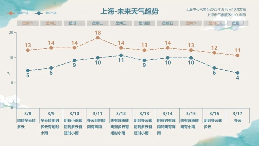 据市气象部门预报,明天气温将再升一截,全天在6-14℃之间,云系增多,转为多云到阴,夜间有短时小雨。下周受暖湿气流影响,上海将出现阴雨,主要降水过程出现在周一、周三和周六前后,雨具要常备身边。气温稳中有升,预计最高气温13~16℃,最低气温也有9~11℃,春天的脚步越来越近。
