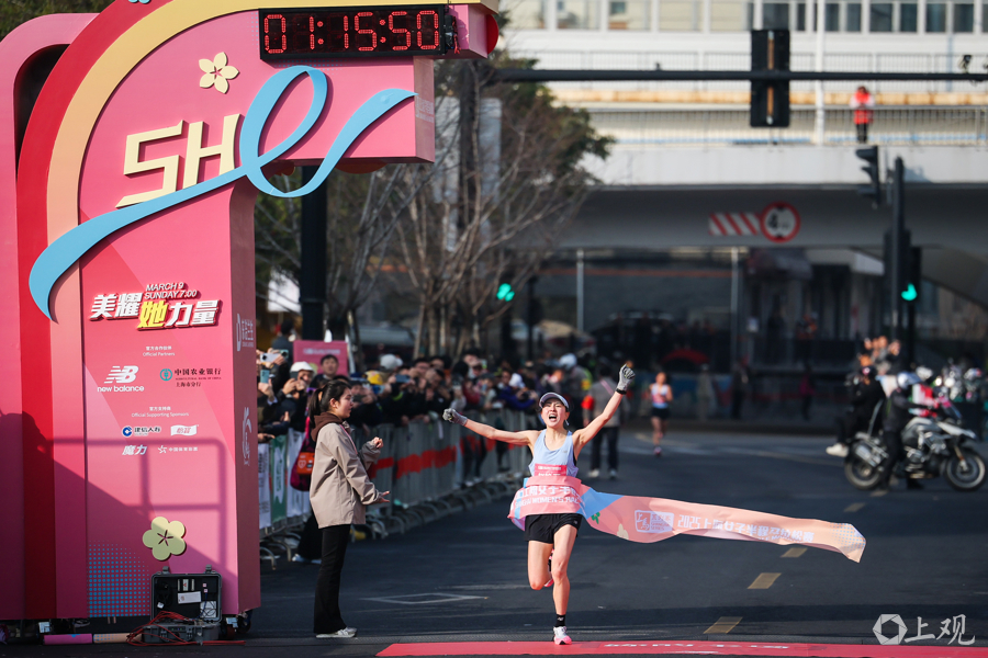 赵艳丽以1小时15分49秒的成绩第一个冲过终点线,摘得2025上海女子半程马拉松赛的桂冠。