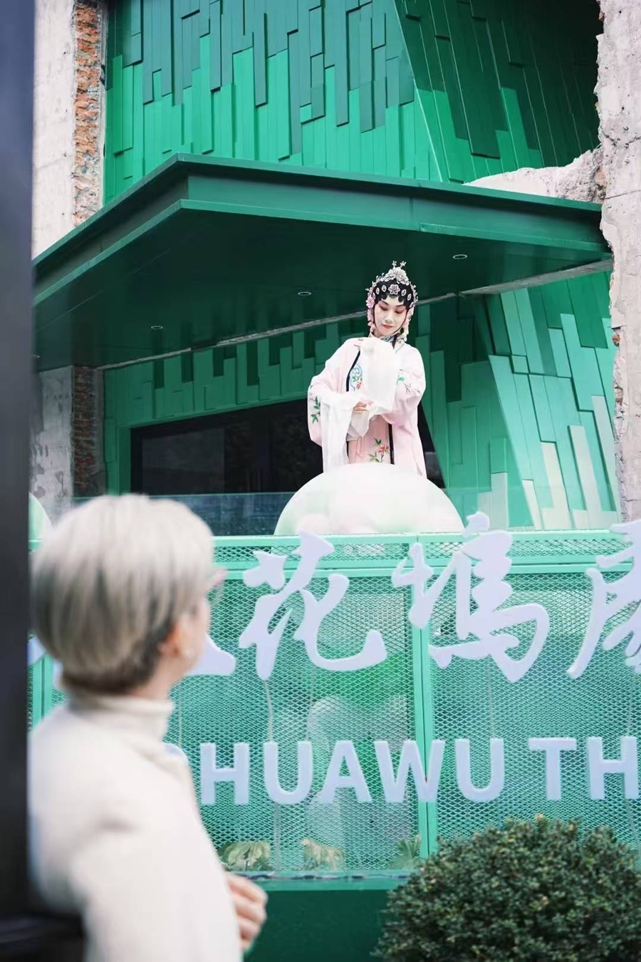 “剧场外侧特意保留了被拆除的痕迹,与内侧华丽鲜艳的造型形成鲜明对比。绿色金属墙与毛糙不讲究的水泥柱,混搭出新旧交融,也寓意着唐伯虎的创作力穿破屋顶而出,挣脱了原有老房子的束缚,跳出公众刻板印象的所谓成功,迎来属于自己的艺术人生新拐点。”亲历桃花坞剧场从设计草图到落成开业,上海建筑师俞挺告诉记者,剧场设计构思源于对唐伯虎艺术与人物精神的洞察——唐伯虎虽仕途失意,却通过文艺创作打破封建观念桎梏,也借此展现新旧建筑交织的独特美感。