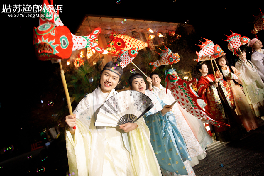 夜幕降临,桃花坞剧场的青年演员们,身着戏服在姑苏渔郎桥浜上演快闪舞蹈。百余条传统非遗鱼灯骤然点亮,一盏盏鱼灯在水纹灯和浪花幔帐的映衬下,构建出沉浸式东方美学剧场。