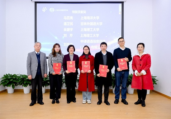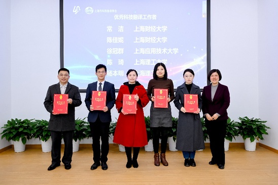 接下来的颁奖仪式上,学会为长期投身科技翻译事业的第八、第九届理事会理事长何刚强教授颁发“终身成就奖”,为在翻译技术研发、学科建设等领域作出突出贡献的11位高校教师和行业人员颁发“特别贡献奖”个人奖,2家单位颁发“特别贡献奖”机构奖,并表彰了15名“优秀科技翻译工作者”。获奖者来自上海理工大学、上海外国语大学、上海财经大学、上海师范大学、上海交通大学、同济大学等十余所高校和企业。我校外语学院吴碧宇教授和刘芹教授荣获“特别贡献奖”,陈琦教授和杨本明教授被授予“优秀科技翻译工作者”称号,获奖总人数为上海高校之最。