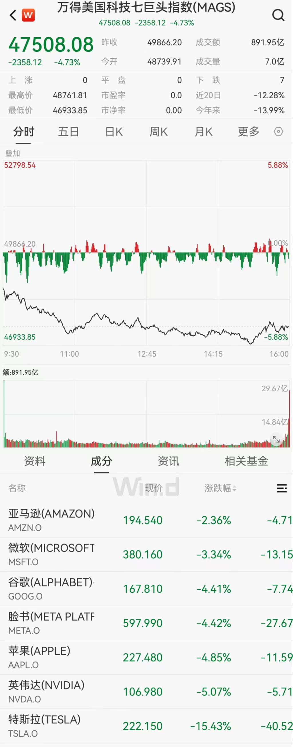 科技股大跌。万得美国科技七巨头指数跌4.73%,特斯拉跌逾15%,创2020年9月以来最大单日跌幅,收于222.15美元/股,股价距历史高位已腰斩。英伟达跌逾5%,谷歌A、Meta、苹果跌逾4%,微软跌逾3%,亚马逊跌逾2%。