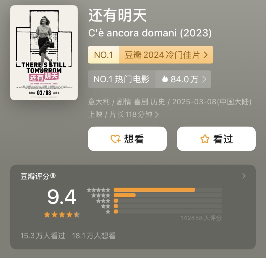 有一部电影,它的排片是很少的,上映四天日均不超过6%,不仅距《哪吒之魔童闹海》近40%的排片遥不可及,与同为3月8日上映的《天堂旅行团》相比,也几乎只有一半。它没有中国观众熟悉的导演和演员,它讲述了一个意大利几十年前的故事,但它却有着叫人不可忽视的口碑。在上映前,这部电影揽下第69届意大利电影大卫奖最佳新导演、最佳原创剧本、最佳女主角、最佳女配角、青年大卫奖及观众奖六项大奖,并跻身意大利影史票房第九,是目前意大利票房最高的独立影片。在3月8日上映后,这部电影的豆瓣评分从9.1分涨至9.4分,猫眼、淘票票更双双以9.6分高分开场。