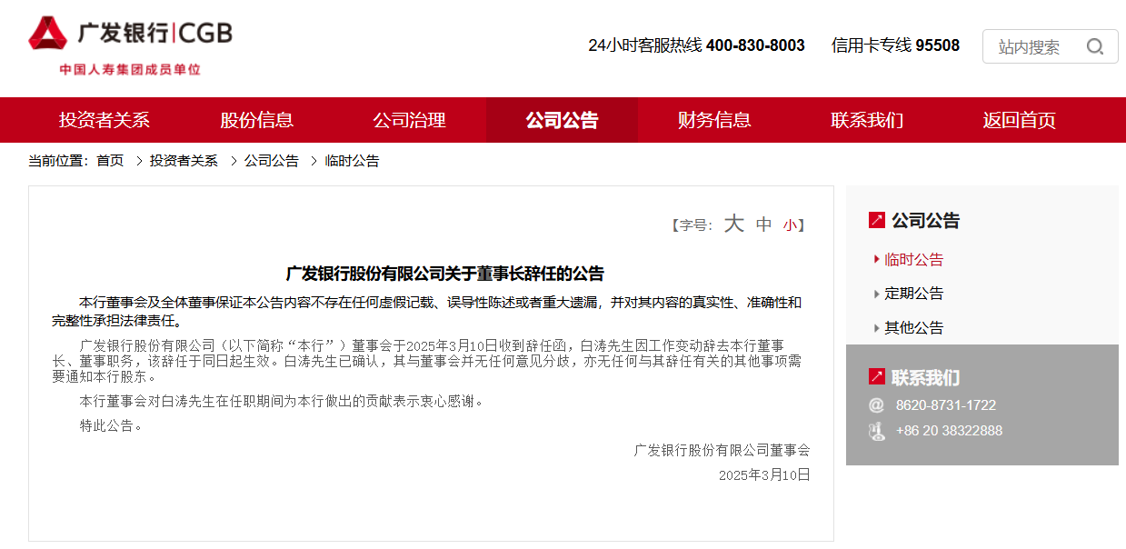 3月11日,广发银行官方发布公告,该行董事会于2025年3月10日收到辞任函,白涛先生因工作变动辞去本行董事长、董事职务,该辞任于同日起生效。