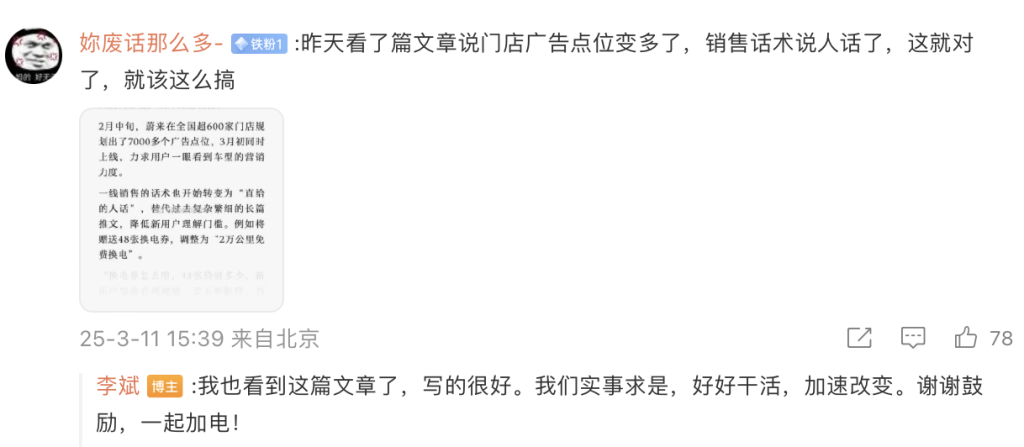 3月11日,李斌本人也在微博上就内部变革一事回应网友说,“我们实事求是,好好干活,加速改变。谢谢鼓励,一起加电!”