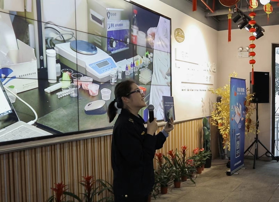 活动现场,快速检测项目以“一镜到底”的直观形式呈现,通过大屏幕全程零距离直播,市民可以清晰看到菜场中心快检室对猪肉进行瘦肉精检测的全流程操作:从样本的称重、粉碎,到试剂的添加、反应,再到仪器的数据分析,每一步都公开透明。同时,“你送我检”项目也在市民身边同步开展,工作人员对市民送检的食材开展了蔬菜农药残留、大米新鲜度、注水肉的快速检测项目,全程边操作边讲解,从样本采集到结果判断,每一个细节细致展现,真正实现了食品安全“看得见”。