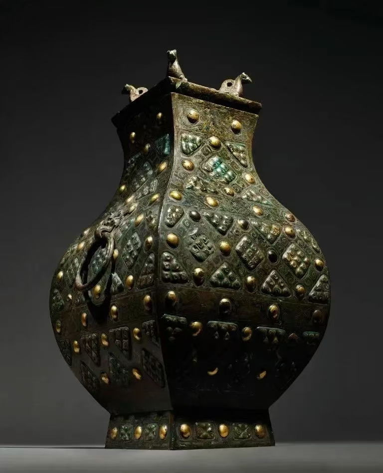 战国 青铜错金银嵌琉璃乳钉纹方壶
