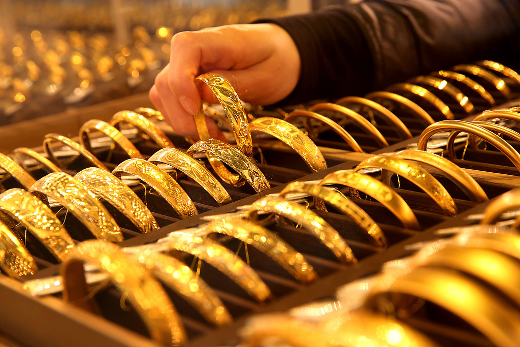店员正在整理上柜销售的黄金饰品。视觉中国 图