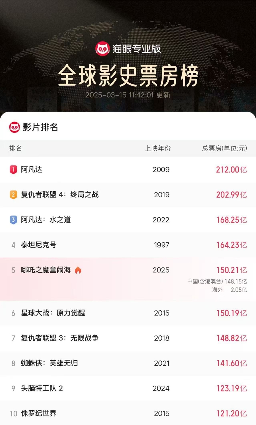 刚刚!据猫眼专业版数据,《哪吒之魔童闹海》累计票房(含海外及预售票房)超150.19亿元,超《星球大战:原力觉醒》票房成绩,冲进全球票房榜前5!