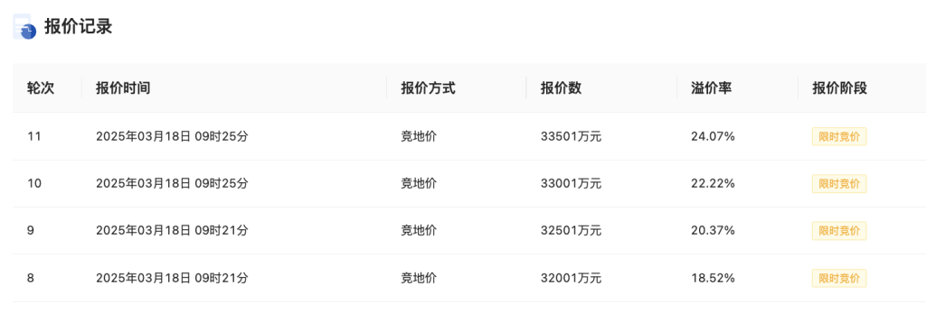 竞价记录显示,该地块经过18轮竞价后由绿城房地产集团有限公司以总价203973万元竞得,成交楼面价20171元/平方米,溢价率9.09%。