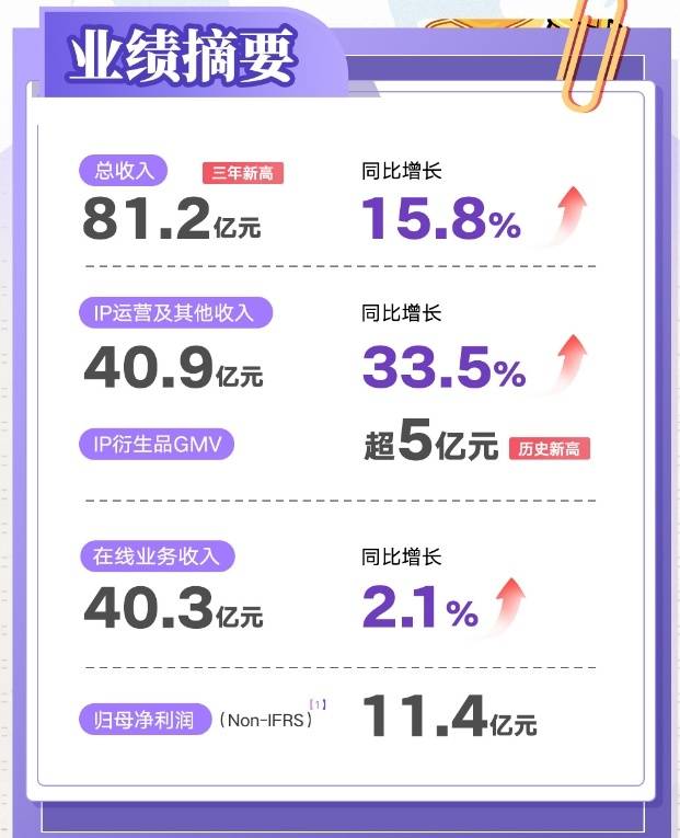 阅文集团2024年总收入有所上升,原因是其版权运营及其他业务收入取得大幅增长,并成为这半年来拉动收入的主要引擎。财报显示,其IP运营及其他收入为40.9亿元,同比增长33.5%,在总收入中占比过半;其中,IP衍生品GMV超5亿元。在线业务收入为40.3亿元,同比增长2.1%,MPU同比提升4.6%达910万。