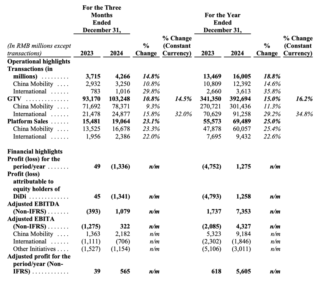 滴滴在2024年第四季度延续了前三季度的增长趋势。