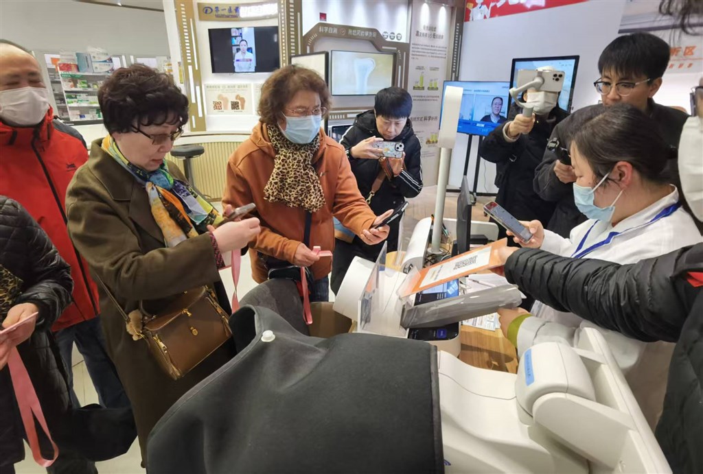 老年人持“五边十色”助老服务卡刷卡后,在第一医药商店体验健康监测服务
