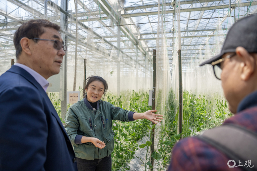 雷利锋向叮咚买菜采购员介绍鲜花生长状况。