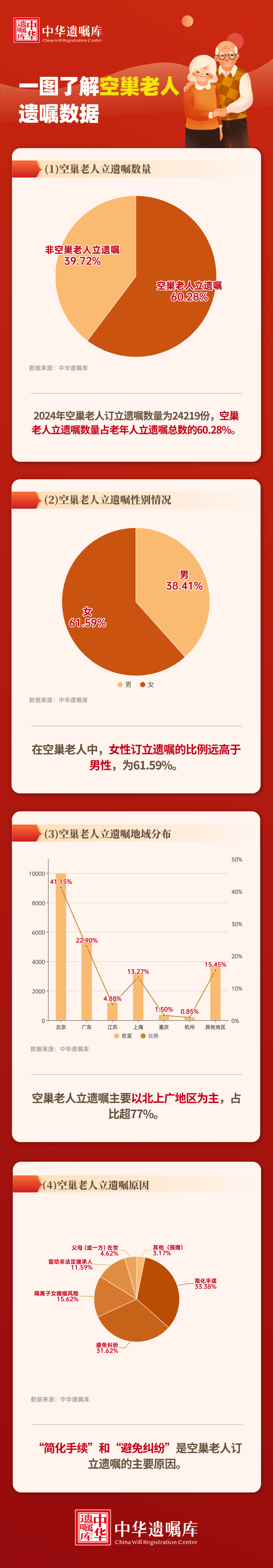 数据显示,2024年全国60岁以上老年人遗嘱登记总量为40176份,其中空巢老人占比高达60.28%,北京、上海、广东等经济发达地区成为主要集中地,这三地空巢老人遗嘱登记量占比超77%。