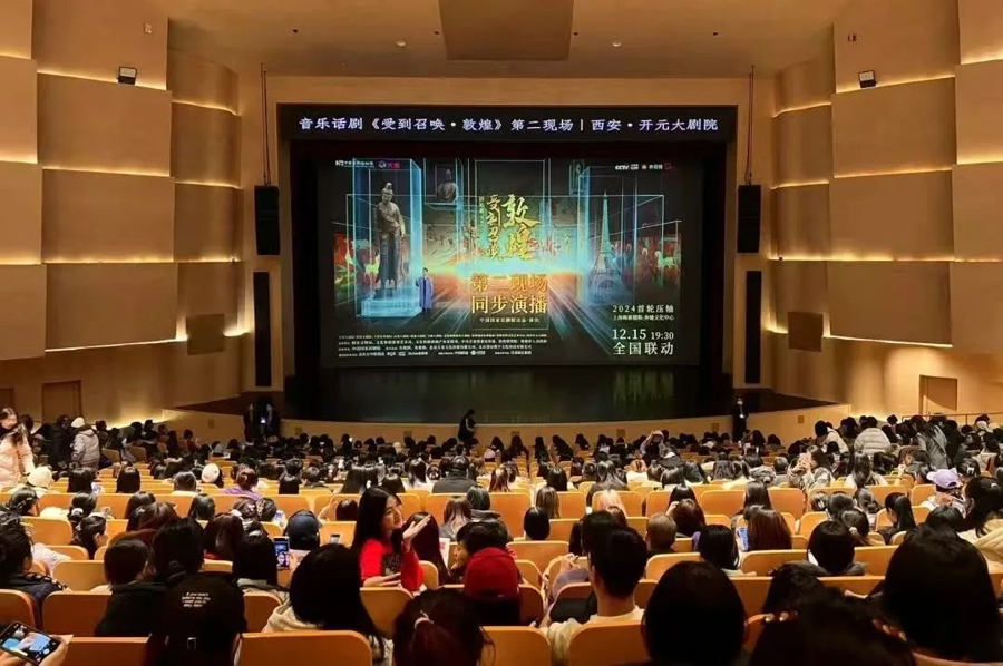 去年12月,音乐话剧《受到召唤·敦煌》继续突破舞台艺术和技术边界,采用“AI+3D+即时影像+动画真人融合”,并在收官之夜开启“第二现场”八省(市)十地联动同步演播。均价100元的票价吸引近8000人观看,弥补了不少无法前往“第一现场”的观众的遗憾。