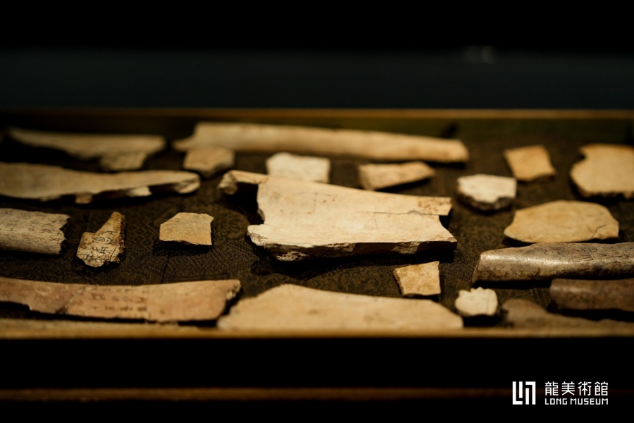 故事从三千多年前商代的一组甲骨文展品开始讲起。这是分别陈列于两个展柜的共三函、35件甲骨,其中牛胛骨十八片、龟甲十六片,疑似象牙质器物构件一枚,上面刻有神秘的甲骨文。这是中国最早的成熟的文字系统,以龟甲、兽骨为书写载体,凝固的不仅有商代占卜活动,更有先民对天地神灵的敬畏与社会制度的规范。通过对甲骨文的解读,商代政治、经济、宗教等历史细节得以重生。