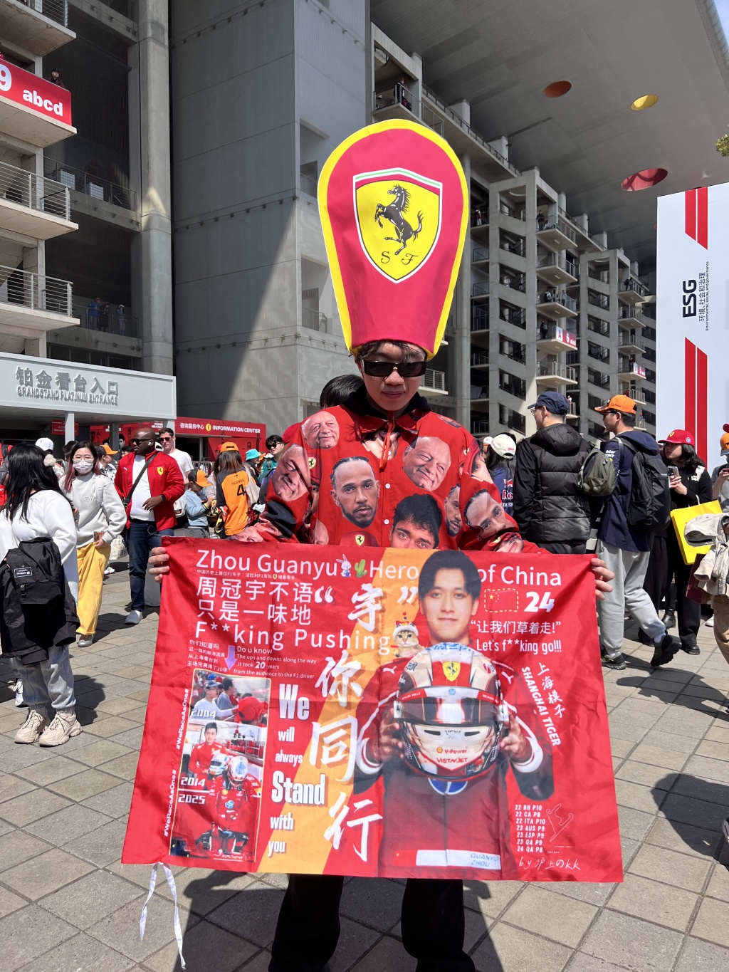 澎湃新闻记者现场看到,车迷们普遍精心装扮,穿戴着赛车服饰。Matt来自安徽,是攻读摄影专业的大二学生。她穿戴着法拉利标志性的红色衣服和帽子,手持一把中国风扇子,上面写着车手勒克莱尔的名字。开赛两天前她已赶到上海,追逐喜爱的车手所参加的快闪活动。