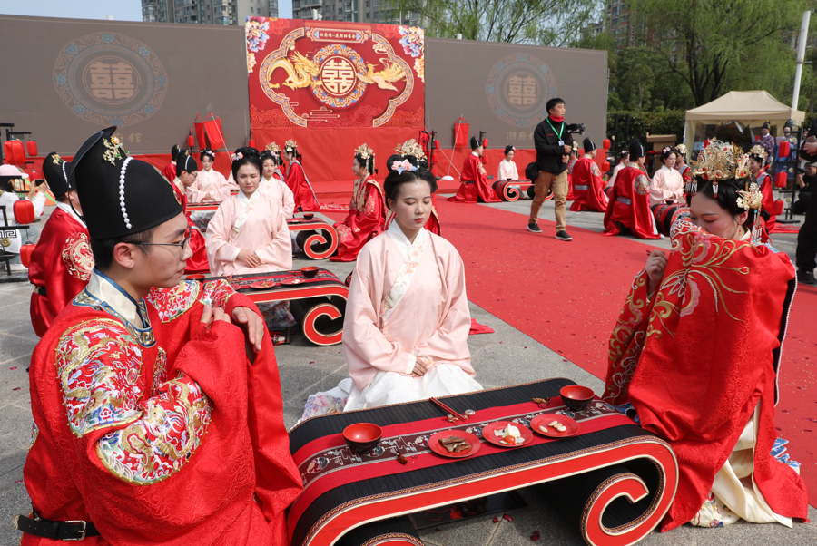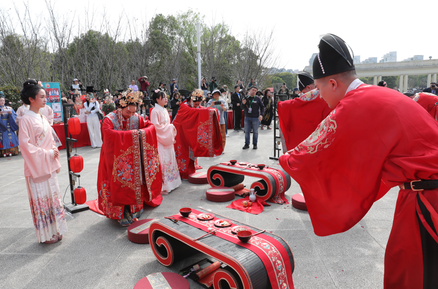 “花朝月夜动春心,谁忍相思不相见”。花朝节不仅是百花的生日,更寄托了古往今来人们对真挚爱情的向往和追求。下午2时,新人们以一袭精致的明制婚服,携手步入舞台。通过一组融合传统和创新的“同牢、合卺、结发、盟誓”的婚礼仪式,新人们在“花神”和亲朋好友的欢声祝福下,共同谱写了一曲琴瑟和鸣、天长地久的唯美恋歌。