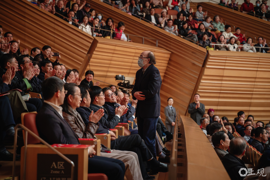 演出间隙,指挥家余隆特别向《中国,我可爱的母亲》的作者陆在易致敬,陆先生起身回礼,获得全场观众热烈的掌声。