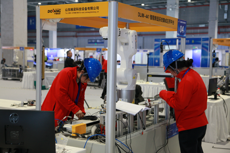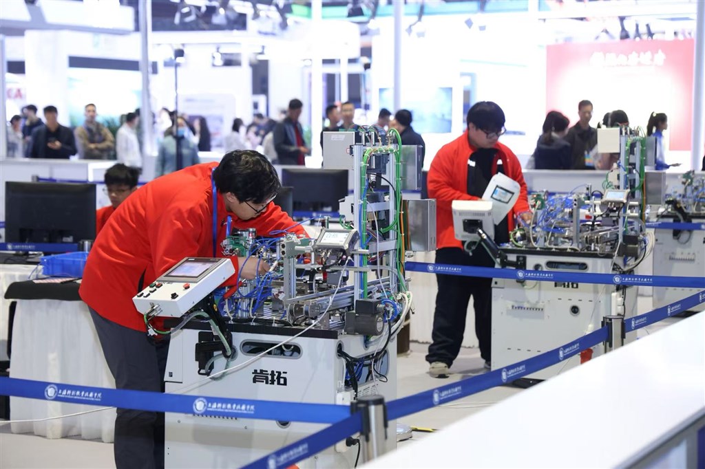 “工业4.0是一个双人项目。一个人要让生产线转起来,一个人要让生产线智能化。此次比赛简化了流程,主要是三个模块比拼。”袁海嵘表示,国内的选手在基本技能上,只要反复练习就能“铁杵磨成针“,但站在国际赛场上,解决问题的思维方式和英文沟通能力是我们更需要克服的难题。在世赛时,国外裁判会随时指令,比赛期间还会发布外国专家写的代码,选手拿到后要进行修订优化,4天的比赛每天都要写一份全英文的论文报告,这些要求都不低。 去年世界技能大赛工业4.0项目两位金牌选手卢俊威、谢辉铉,此番变成教练,带着上海科创职业技术学院的学生前来参赛了。从选手变教练,不仅传授比赛经验,也带来了许多训练资料。“不单单是提高参赛选手的水平,我们的愿景是把上海乃至中国整个智能制造的水平提升。”袁海嵘透露,正与世赛实训基地、世赛选手一起,进行工业4.0项目的成果转化以及教材编写,也正计划邀请工业4.0项目的欧洲强队前来交流学习,通过学习新技术新标准,带动技能人才队伍整体素质提升。 技能大赛成新技能风向标 紧跟产业发展趋势是技能大赛的“标签”之一,在这里你能看到当下社会发展需要什么的技术。记者看到,既有航天器铰链机构装调、虚拟焊接培训等先进制造技术,也有人形机器人、仿生机器狗等人工智能技术。