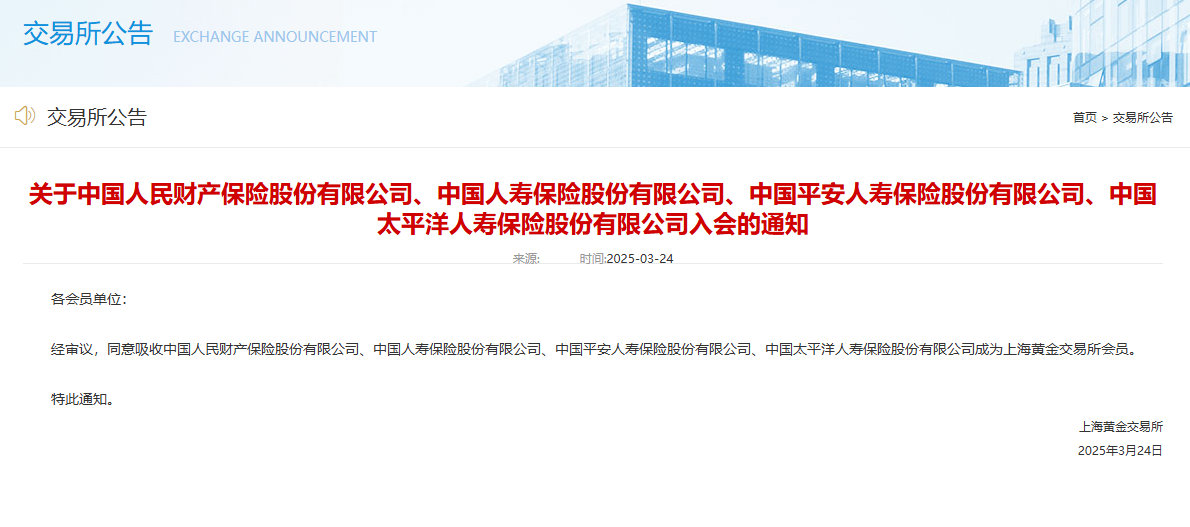 3月24日,据上海黄金交易所披露,该所同意吸收中国人民财产保险股份有限公司、中国人寿保险股份有限公司、中国平安人寿保险股份有限公司、中国太平洋人寿保险股份有限公司成为上海黄金交易所会员。