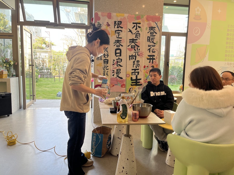 现场活动精彩纷呈。一场接龙自我介绍让青年迅速打破陌生感,在共同完成任务中自然开启对话;社区烘焙达人李慧现场教学戚风蛋糕制作,青年们分组协作,从精准称量糖粉、面粉到创意裱花装饰,将香甜美味的蛋糕化作精美的春日艺术品;专业教师通过分步讲解双人SASA舞的基础动作,引导青年们在节奏互动中逐步培养默契、交换舞伴,创造更多接触交流的机会。