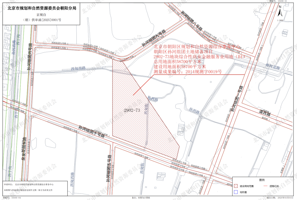 地块出让信息显示,此次组团地块位于北京市朝阳区平房乡、孙河乡。地块交易编号京土储预(朝)〔2025〕012号,即北京市朝阳区平房乡黄杉木店平房区城中村改造项目2107-01、02、03地块及孙河组团土地储备项目2902-73地块,土地面积为148302.262平方米,规划建筑面积282735.7平方米,用地性质为R2二类居住用地、A334托幼用地、 B4综合性商业金融服务业用地。