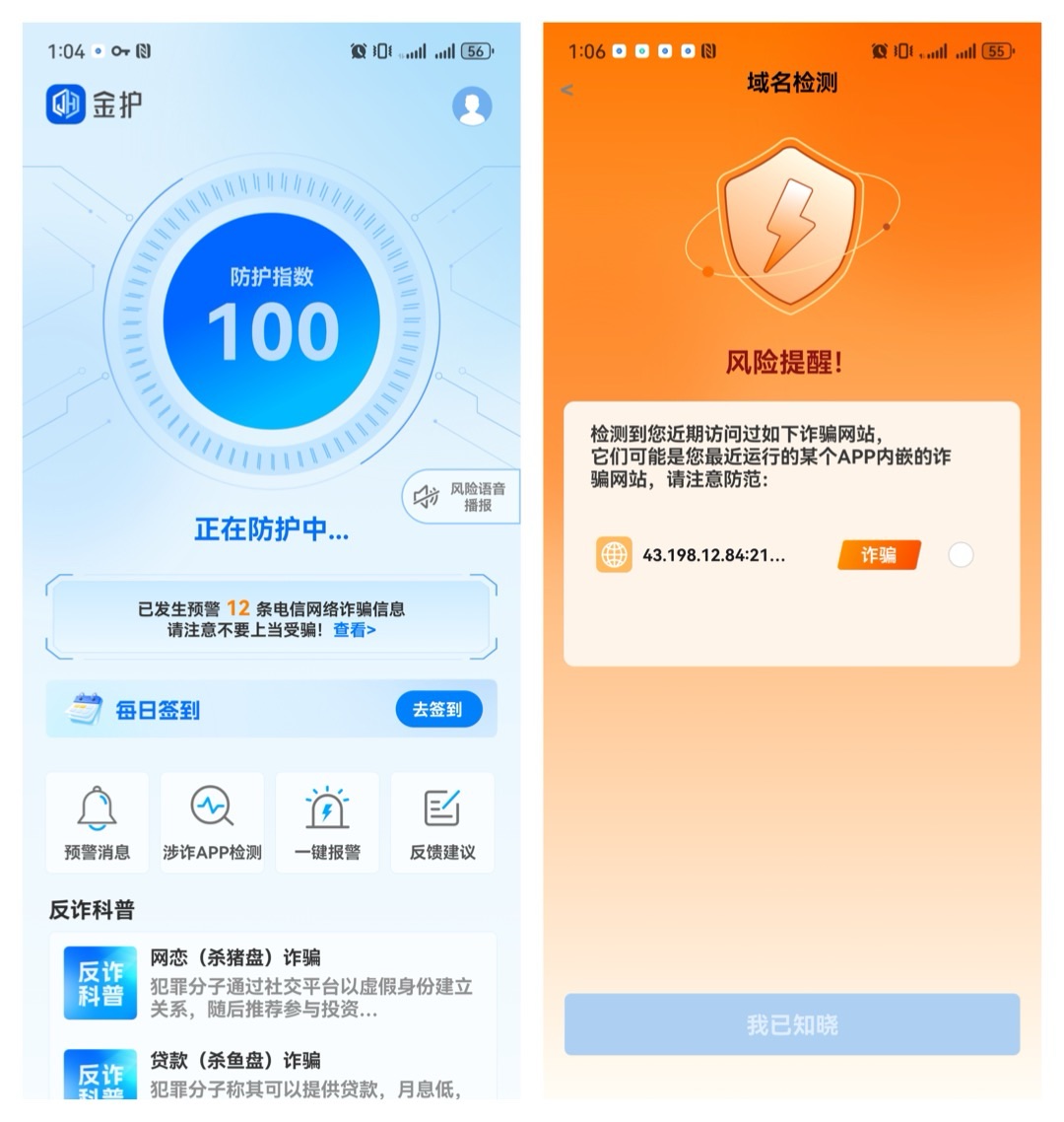 自2023年12月以来,金山警方会同科技公司,历时16个月,共同研发了一款对涉诈APP、网址域名实时性预警的反诈APP “金护”,在历经研发、内测、公测、局部推广等多个阶段后,现已在手机应用商城全面上架。 近年来,网络诈骗案件犯罪嫌疑人大量开发涉诈软件、搭建涉诈网站,诱骗被害人下载登录,精心设置话术圈套实施诈骗,严重危害群众财产安全。 数据显示,自2024年12月1日“金护”APP公测以来,已累计成功预警1800余起网络诈骗,助力全区网络诈骗案件接报既遂数同比下降60%,有效避免了群众财产损失。