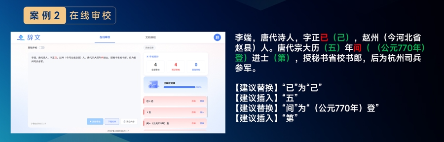 另一则案例中,“辞文”结合古典文学知识库,建议替换“已”为“己”,并解释目标文本中“字正已”与权威资料中“字正己”不一致。《大辞海·古典文学》中明确记载李端“字正己”,因此修订内容将“正已”改为“正己”是正确的。