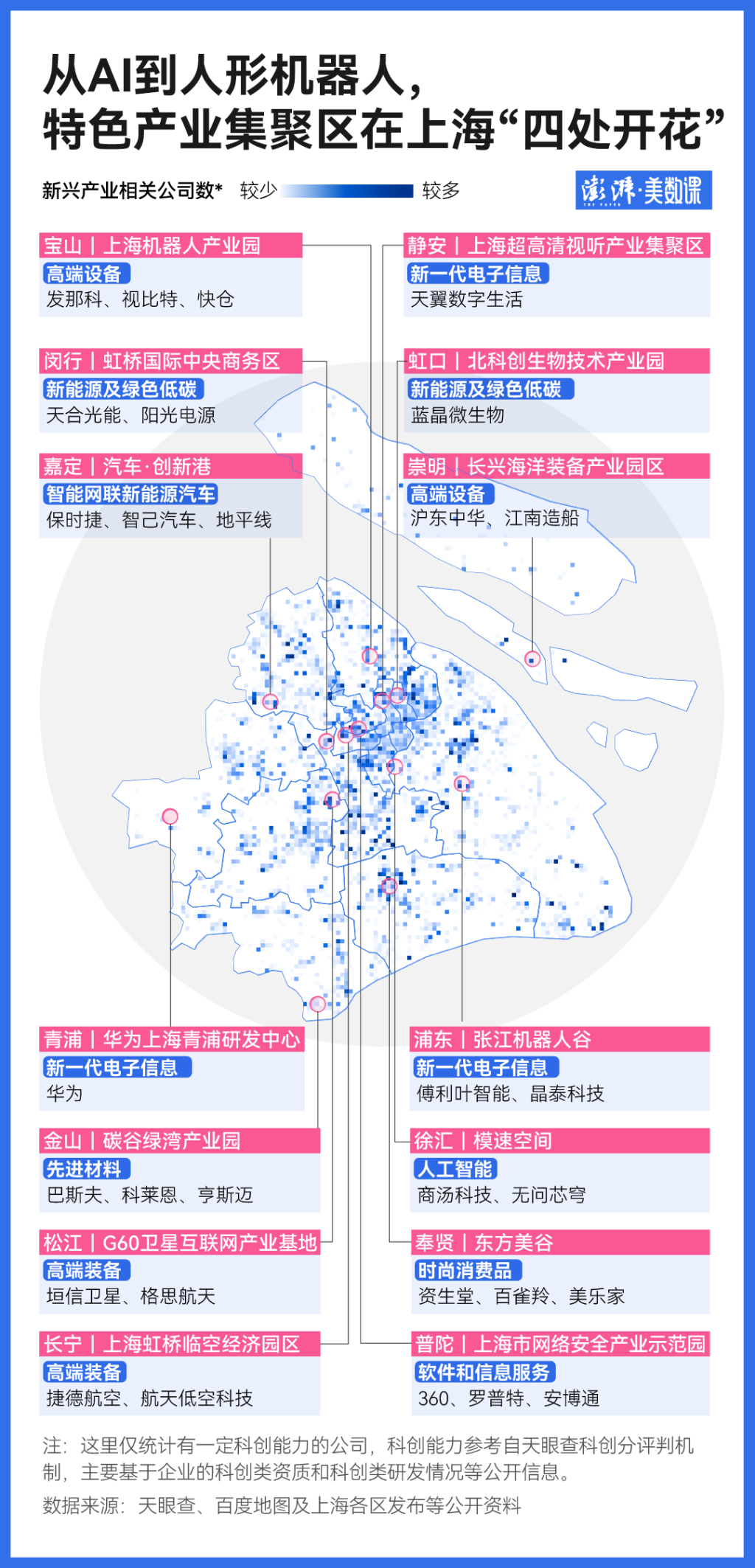 澎湃新闻通过天眼查的企业科创能力分析数据,将这14个集聚区映射到上海科创企业热力图上,发现其中很多都有成熟的产业生态,有自身的产业基础和资源禀赋。