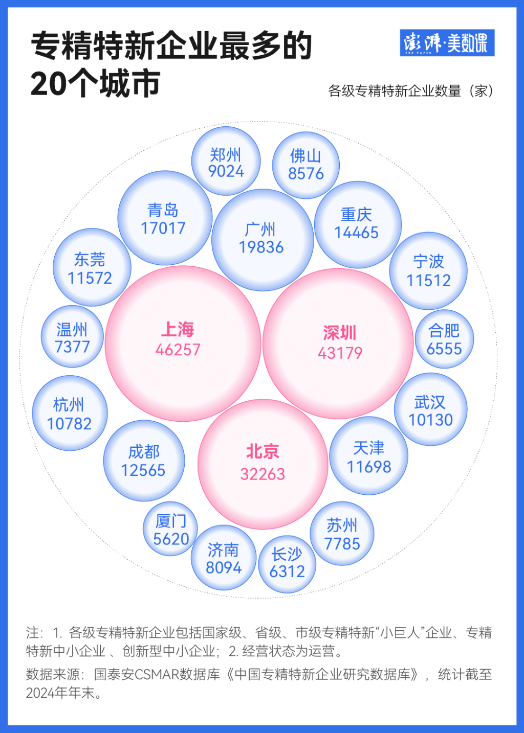 澎湃新闻在梳理《中国专精特新企业研究数据库》中发现,注册地在上海的专精特新“小巨人”企业、专精特新中小企业或创新型中小企业达4.6万家,该数字超过了其他一线城市。