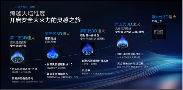 目前3D速火技术已研发至第五代,其独创的黄金三角立体燃烧结构支持28个出火面、224个出火孔无死角加热,热效率最高可提升至78%,同时确保火型均匀稳定,完美适配中式爆炒需求。