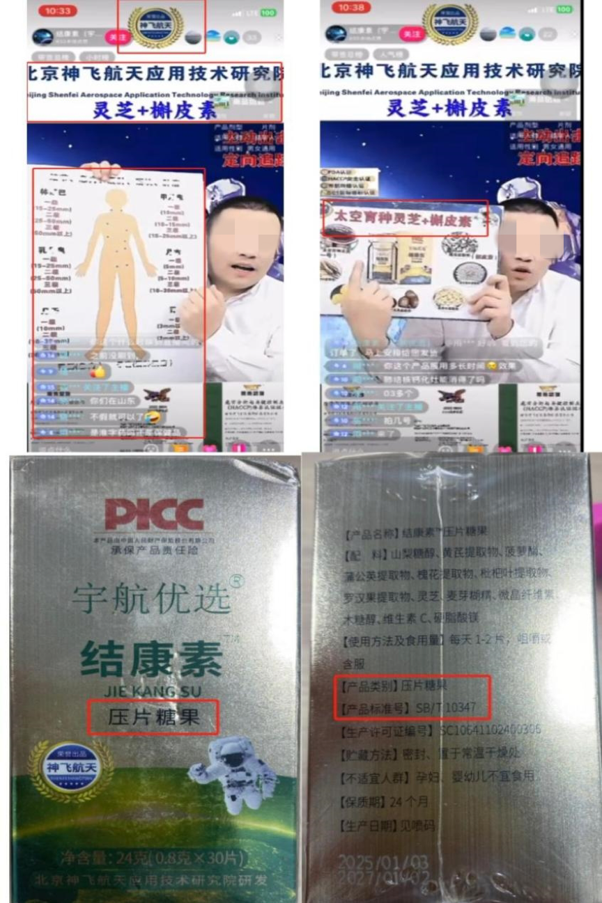 案例⑦:“结康素”直播间在销售一款名为“结康素TM压片糖果”的产品时,主播宣传原料“含有太空灵芝和槲皮素,在没有污染的太空中做到培育和育种”,且具有“阻断、改善、缩小、预防”的功效。