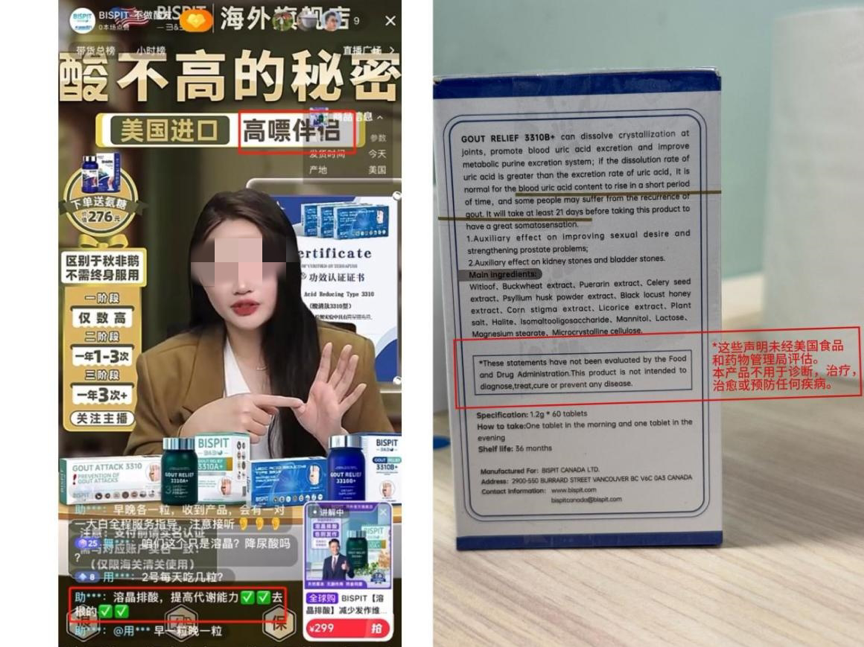 专家组研判后认为,该案例存在误导消费者的行为。非布司他是黄嘌呤氧化酶抑制剂,通过抑制尿酸合成途径中的关键酶(黄嘌呤氧化酶),减少尿酸生成。其核心目的是降低血尿酸水平、减少并发症。这类药物是控制高尿酸血症和痛风的关键药物,需长期规律服用。停药需在医生评估后逐步进行,并配合持续的生活方式干预,以降低复发风险。案例中产品包装也明确标注:“这些声明未经美国食品和药物管理局评估。本产品不用于诊断、治疗、治愈或预防任何疾病。”