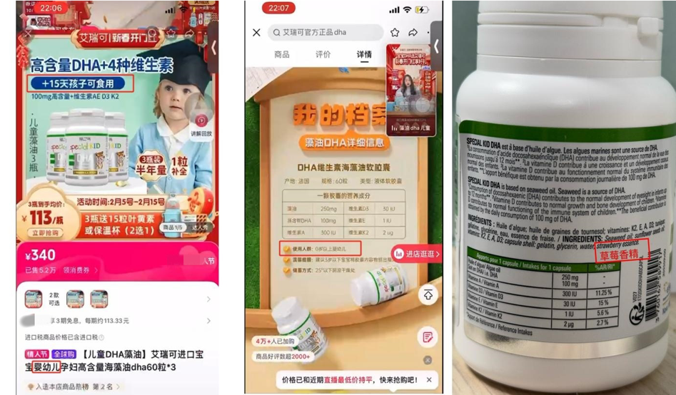 案例⑥:“艾瑞可”直播间在宣传一款名为“ERIC FAVRE LABORATOIRE special KID DHA HUILE D'ALGUE Coeur,cerveau vision”的产品时,有直播间观众问:“0岁就可以吃?”主播答:“对的,孩子落地15天就能吃,因为里面的含量很干净。里面没有大豆油、亚麻籽油、核桃油等,欧盟双C认证。零糖零香精零防腐剂零污染,什么蔗糖乳糖都没有的,所以我们家的营养是孩子落地15天就可以吃。”