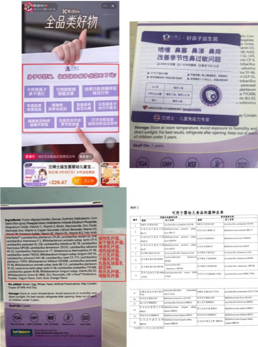 案例④:“陈洁KiKi”直播间在宣传一款名为“Kids Garden Baby AllerRelief Probiotic”的产品时,主播宣称“直播间宣传0岁以上新生婴儿都可以食用”。样品的配料表中标注了添加了植物乳杆菌、副干酪乳杆菌、唾液乳杆菌、嗜热链球菌、约氏乳杆菌、干酪乳杆菌、乳酸乳球菌乳酸亚种、格氏乳杆菌、嗜酸乳杆菌等菌种。