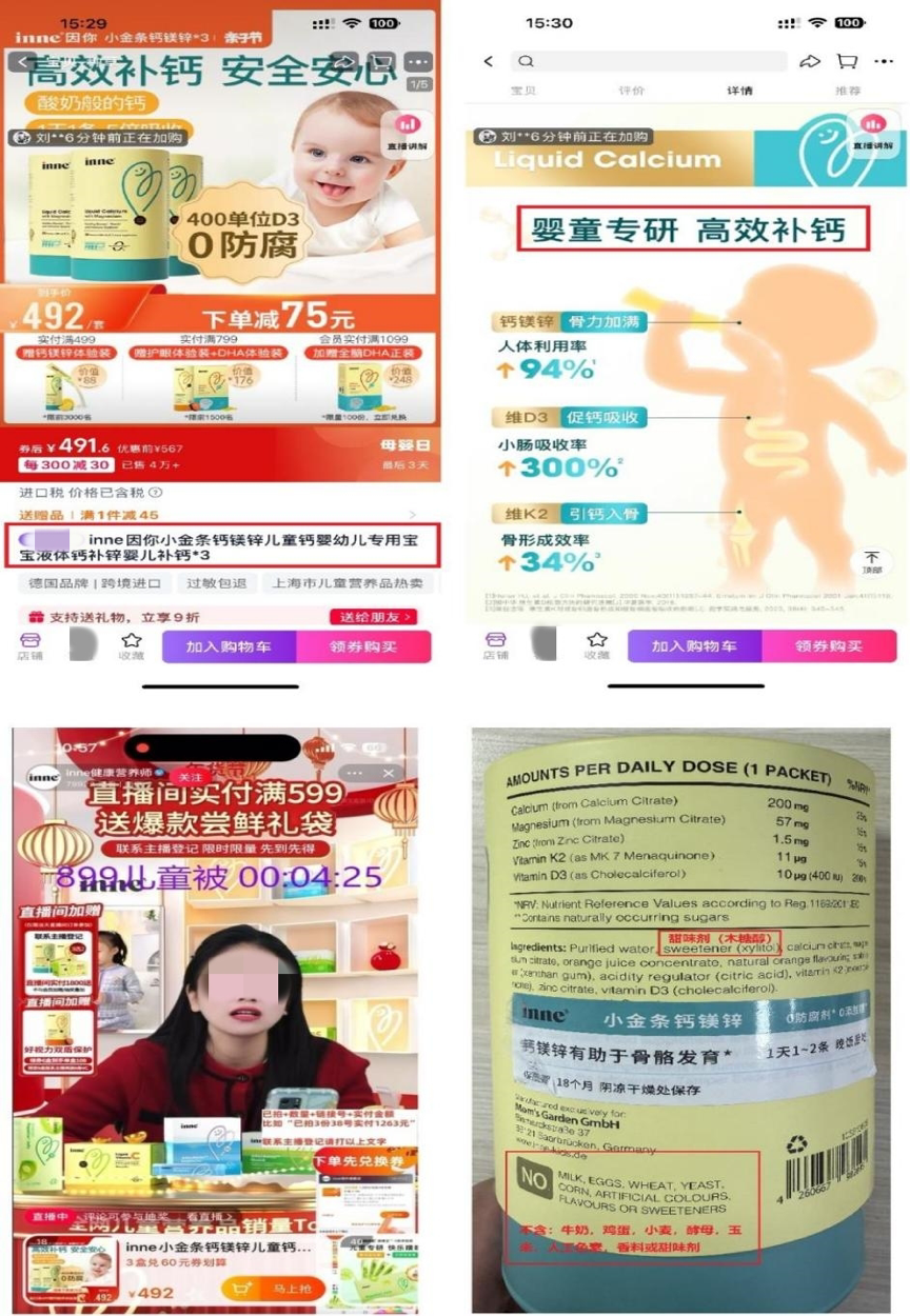 案例⑤:“inne健康营养师”直播间销售的一款名为“inne因你小金条钙镁锌儿童钙婴幼儿专用宝宝液体钙补锌婴儿补钙*3”的产品宣称“婴童专研,高效补钙”。