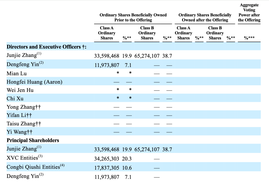 霸王茶姬创始人、茶姬控股董事会主席、首席执行官张俊杰现年30岁,为茶姬控股大股东,持有A类普通股19.9%,持有B类普通股38.7%;现年49岁的尹登峰担任董事、首席运营官,持股7.1%。XVC持股20.3%;琮碧秋实持股10.6%。