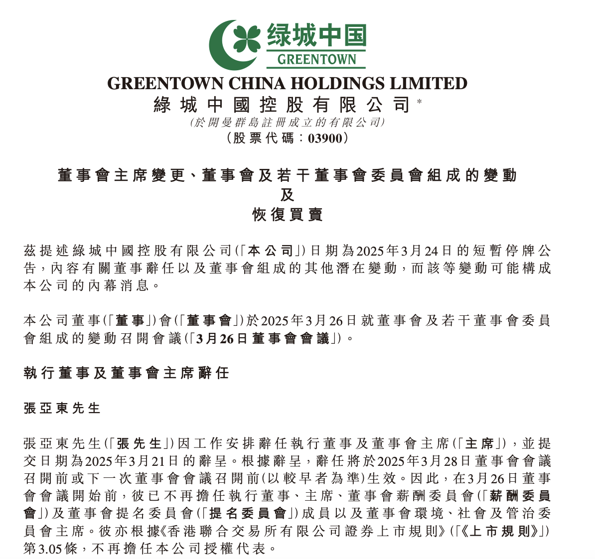3月27日早间,绿城中国(HK03900,股价12.08港元,市值306亿港元)公告称,张亚东因工作安排辞任执行董事及董事会主席。根据董事会决议,自2025年3月26日起,委任刘成云为主席。