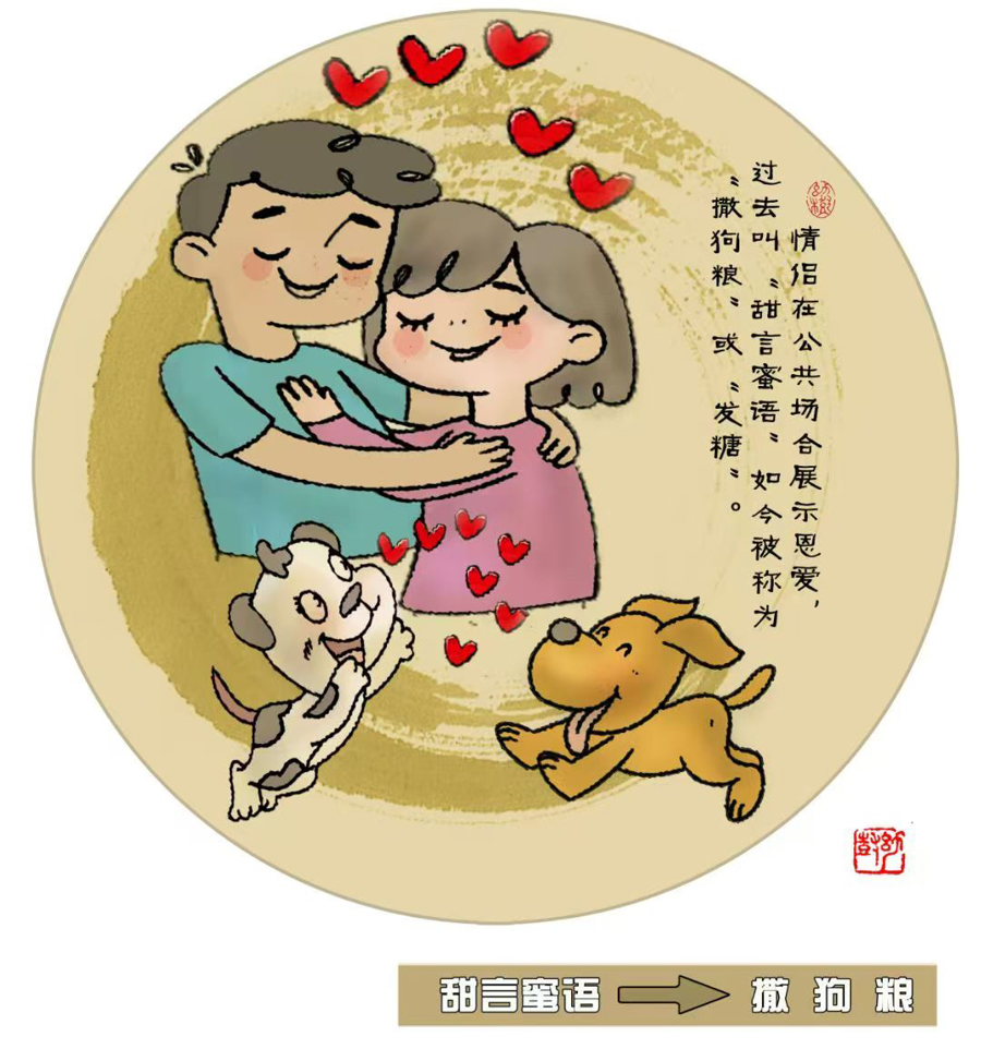 情侣在公共场合秀恩爱,过去叫“甜言蜜语”,如今被称为“撒狗粮”或“发糖”。