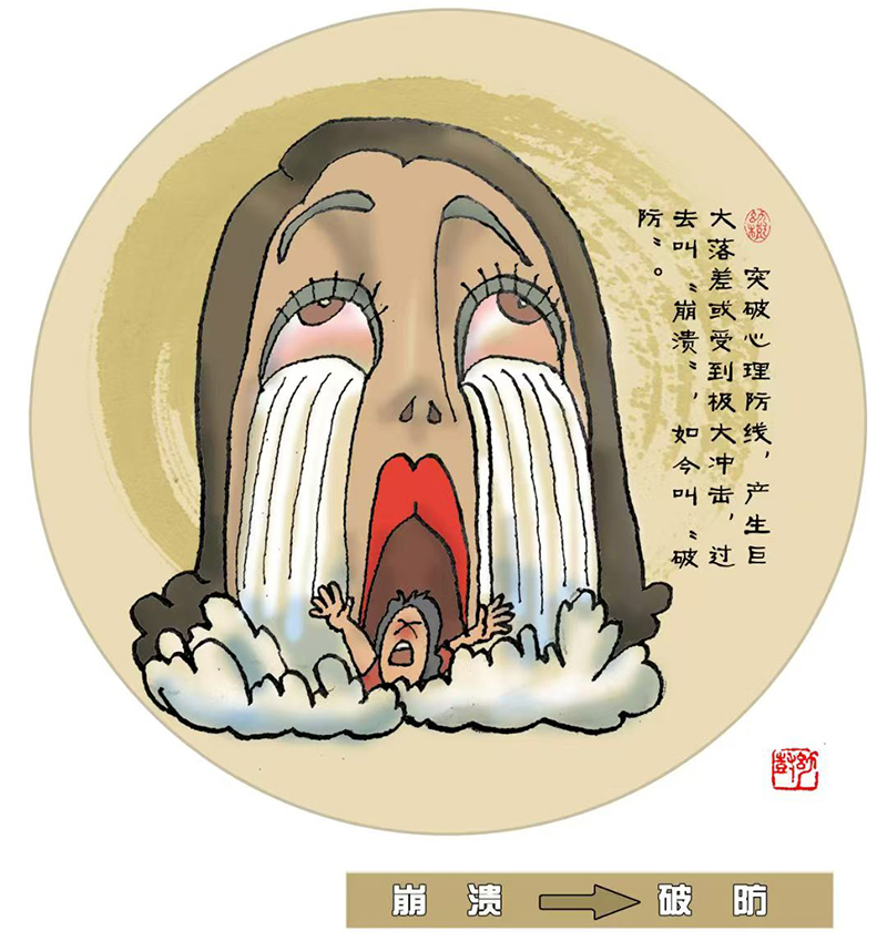 突破心理防线,产生巨大落差或受到巨大冲击,。过去叫“崩溃”,现今称之为“破防”。