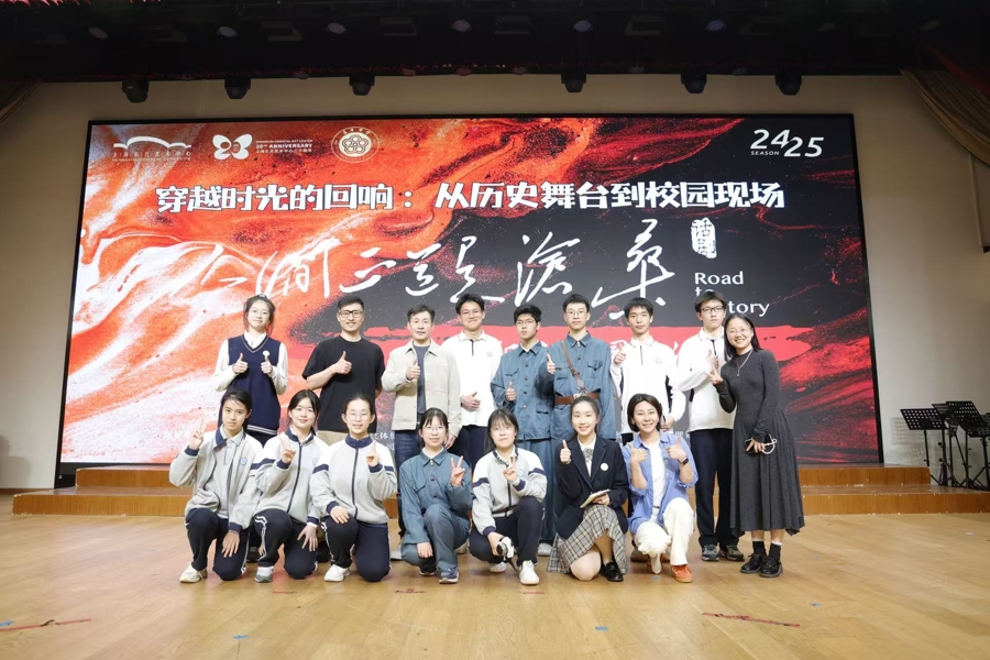 2023年,上海东方艺术中心联合多家机构发起东方美育联盟,持续为参与联盟的中小学输送艺术课程,每年年末举办“东方美育联盟年终盛典”,展示各家成员单位美育成果。2024年,东艺授予版权,与新可风文化公司共同为建平中学量身打造自制剧《人间正道是沧桑》校园版,排演《第一篇章》,并邀请上海话剧艺术中心演员丁美婷担任指导。今年,延续《第一篇章》时间线,挹芬剧社再度排演《瞿恩传》,在艺术实践中引领学生们体会信仰的力量,同样得到剧院的大力支持。打通节目制作与艺术教育,也成为即将迎来20周年庆的上海东方艺术中心平台化建设的重要一环。
