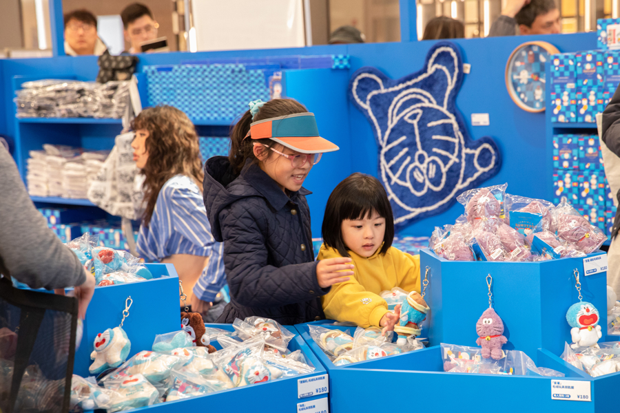 值得一提的是,本次特展还设有限定周边快闪店,特别推出独家主题纪念品,比如自带香气的“铜锣烧”造型毛绒钥匙圈、“紫薯”哆啦A梦造型周边,以及“狸猫造型”毛绒玩具钥匙圈等,为消费者提供多样化的购买选择,近50种授权周边大大满足粉丝的收藏欲。记者来到现场时,提前预约的消费者已排起长龙,大包小包地购买周边商品,掀起情绪消费、治愈经济的又一热潮。