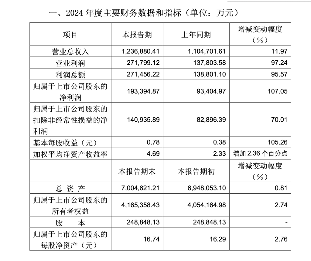 3月28日,上海国际机场股份有限公司(上海机场,600009.SH)发布未经会计师事务所审计的2024年度业绩快报,公司实现营业总收入123.69亿元,同比增长11.97%;归属于上市公司股东的净利润19.34亿元,同比增长107.05%;归属于上市公司股东的扣除非经常性损益的净利润14.09亿元,同比增长70.01%;基本每股收益0.78元,同比增长105.26%。