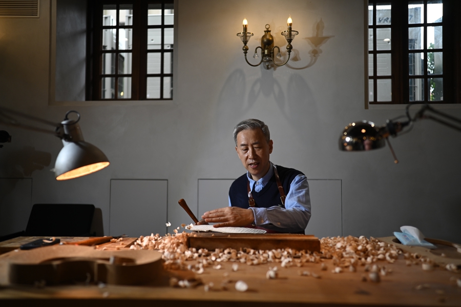 提琴制作工坊上,制琴师王建华正在制作小提琴